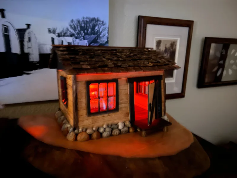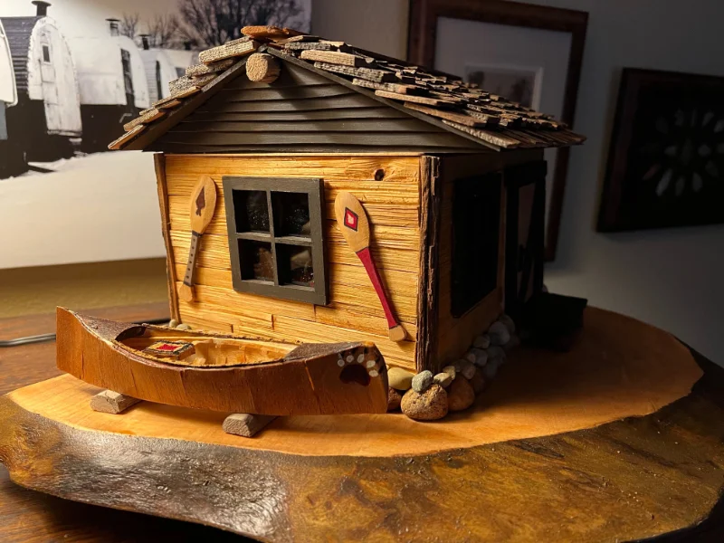 Miniature log cabins carved and assembled by hand. These often feature shingle roofs, tiny windows, and wood-plank siding made from trees on Bill’s property.