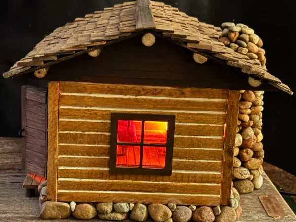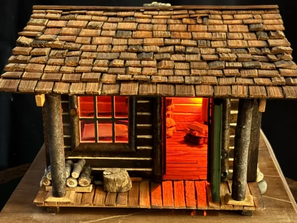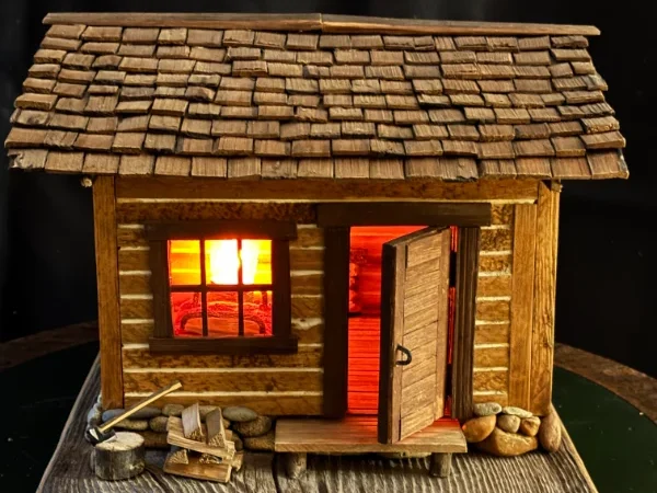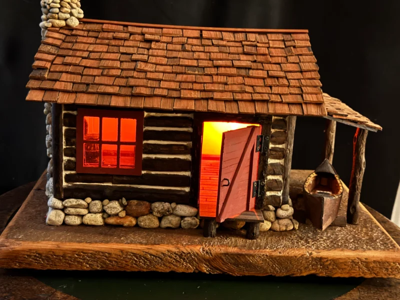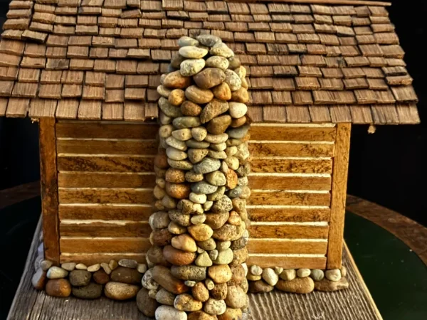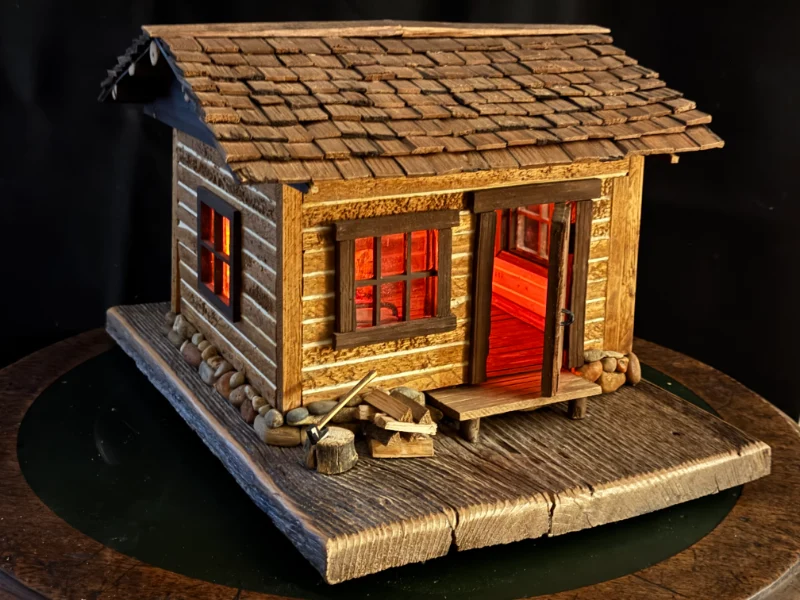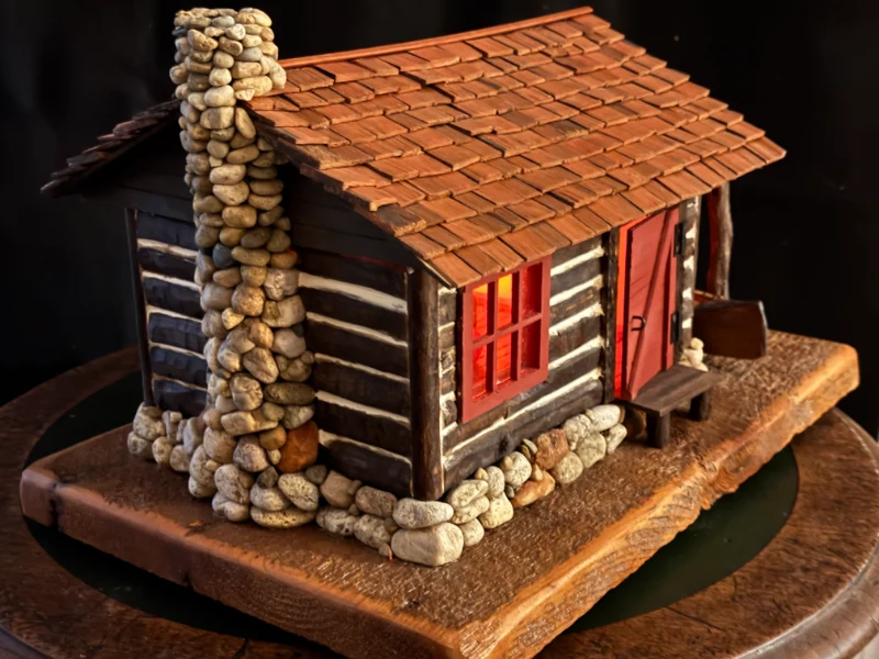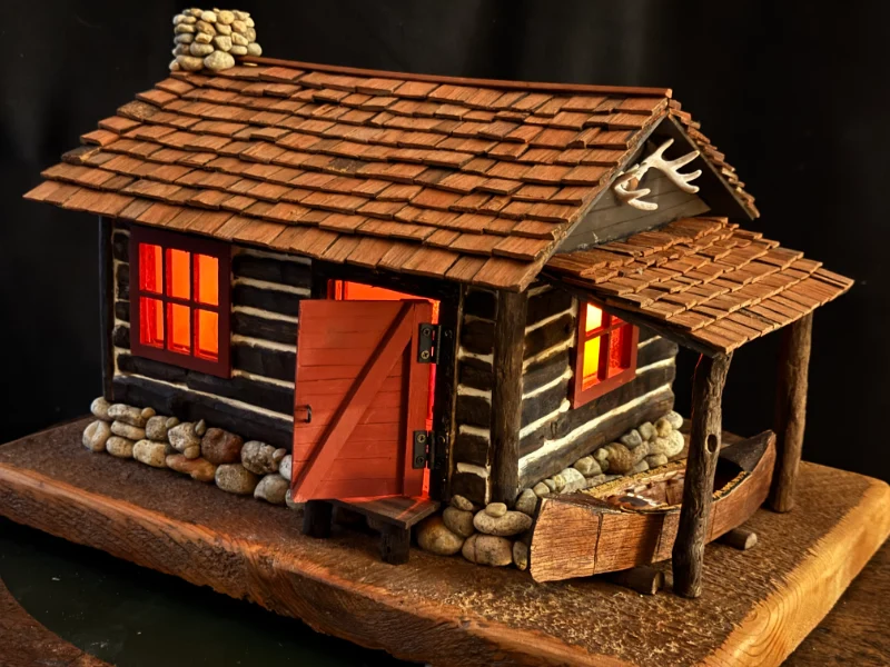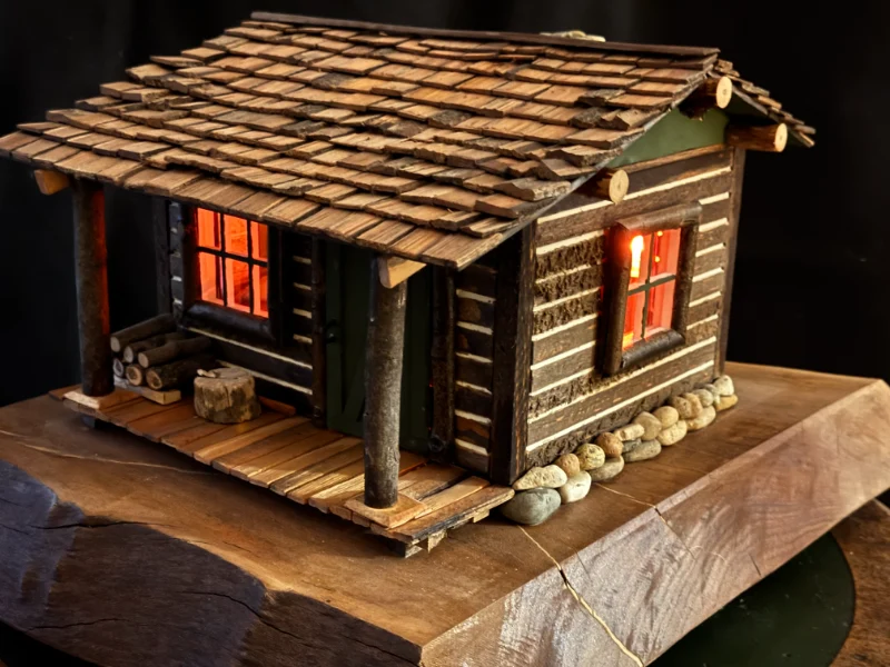 Miniature log cabins carved and assembled by hand. These often feature shingle roofs, tiny windows, and wood-plank siding made from trees on Bill’s property.